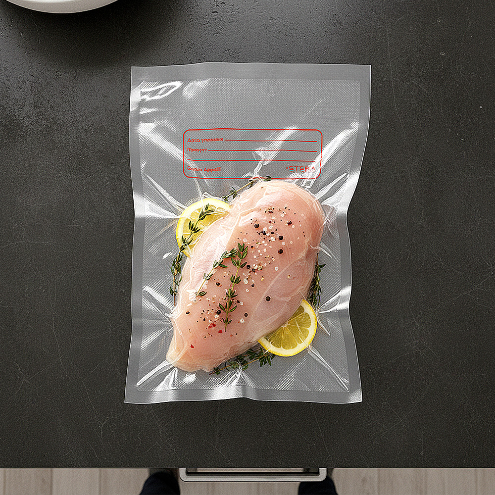 Рифлёная структура обеспечивает глубокий вакуум, пакеты не рвутся даже при контакте с костями. Подходят для мягких продуктов (ягоды, сыры). Зона для записи даты маркером.